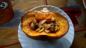 Zucca al forno ripiena di seitan con rosmarino, salvia e zenzero
