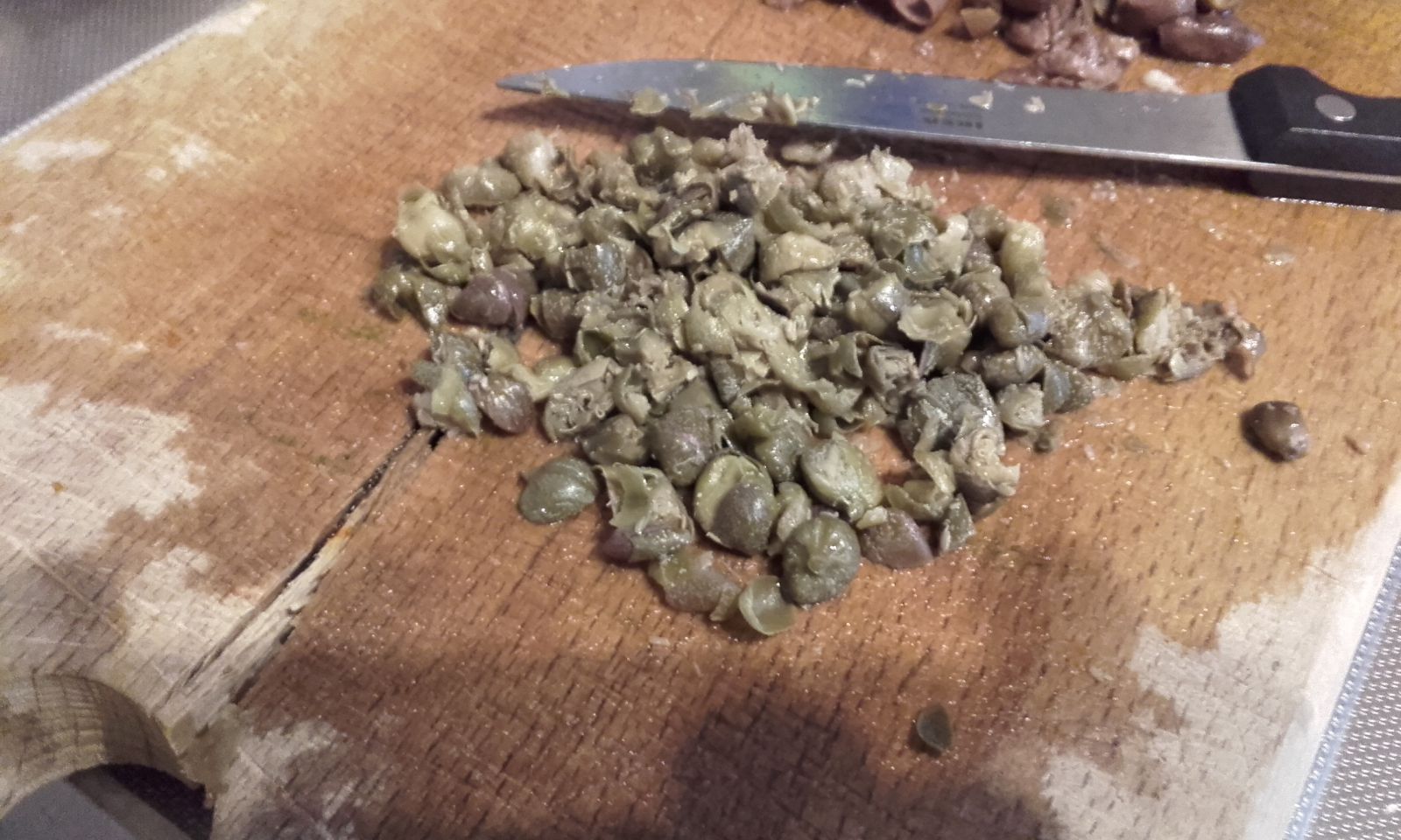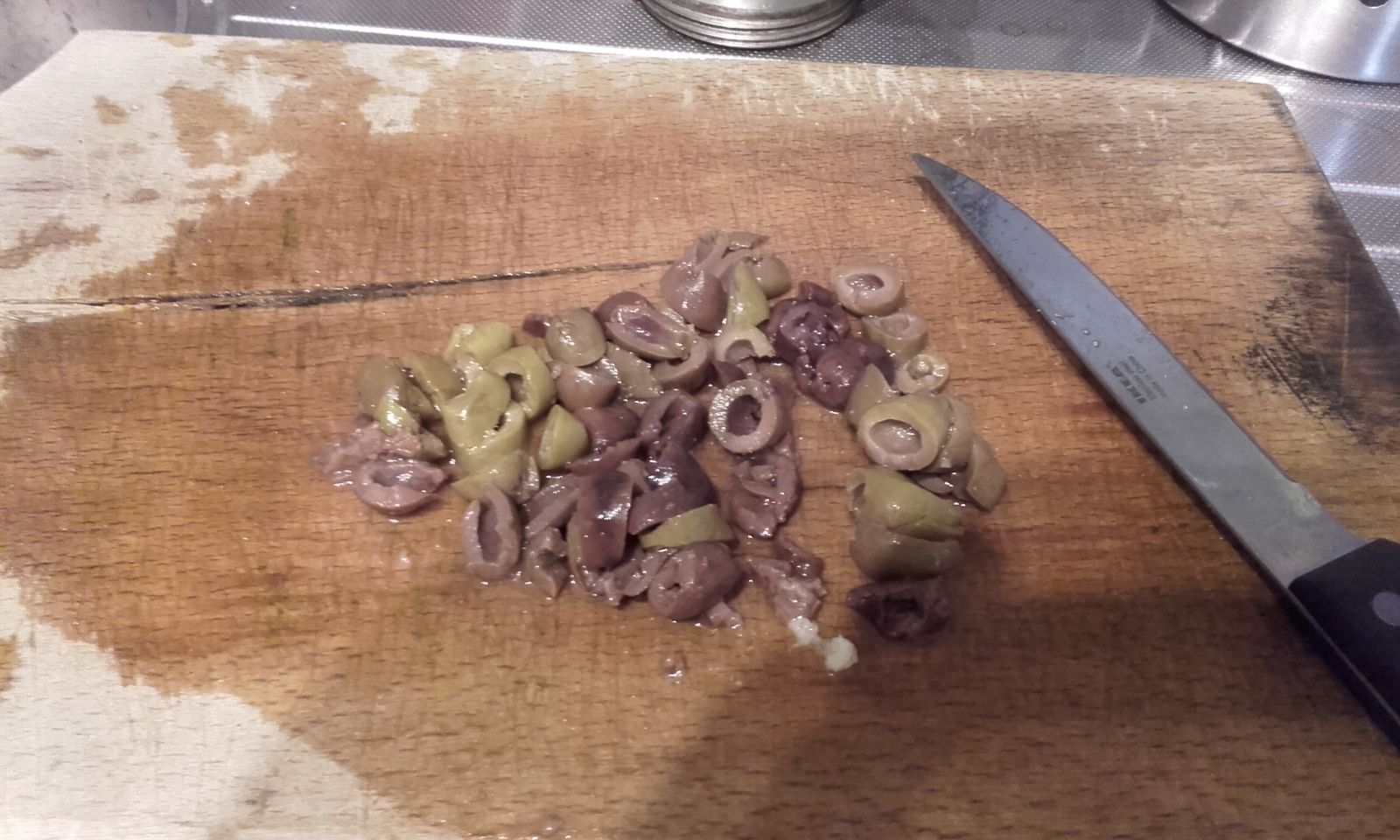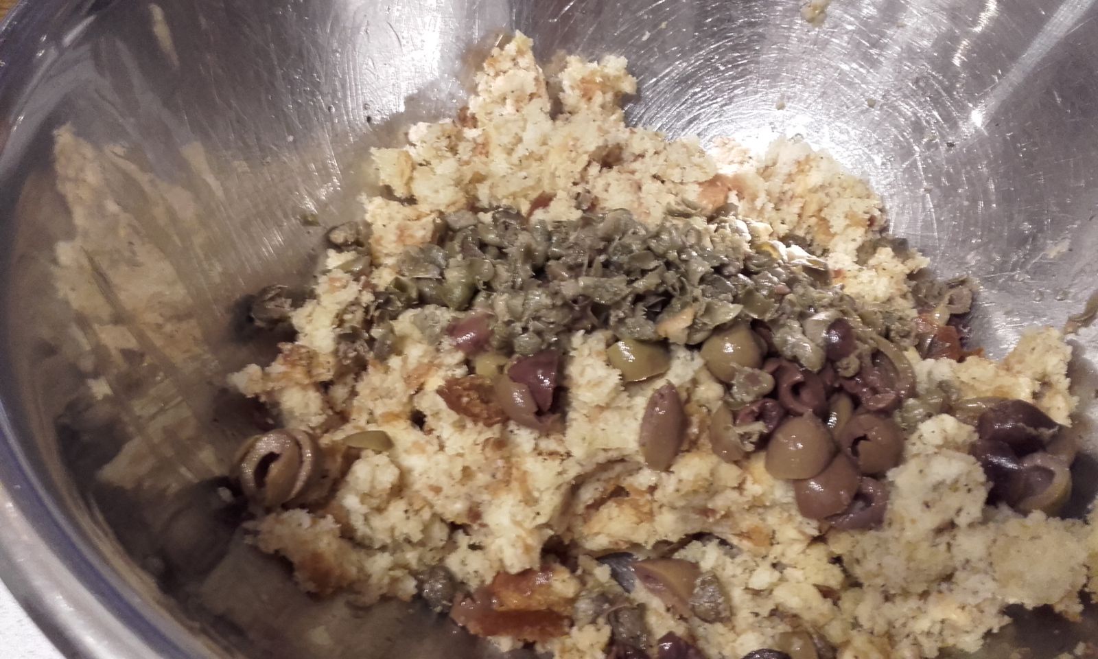 In una insalatiera unire il pane, le olive, i capperi. Condire con olio, sale, pepe ed origano. Mescolare l'impasto | |