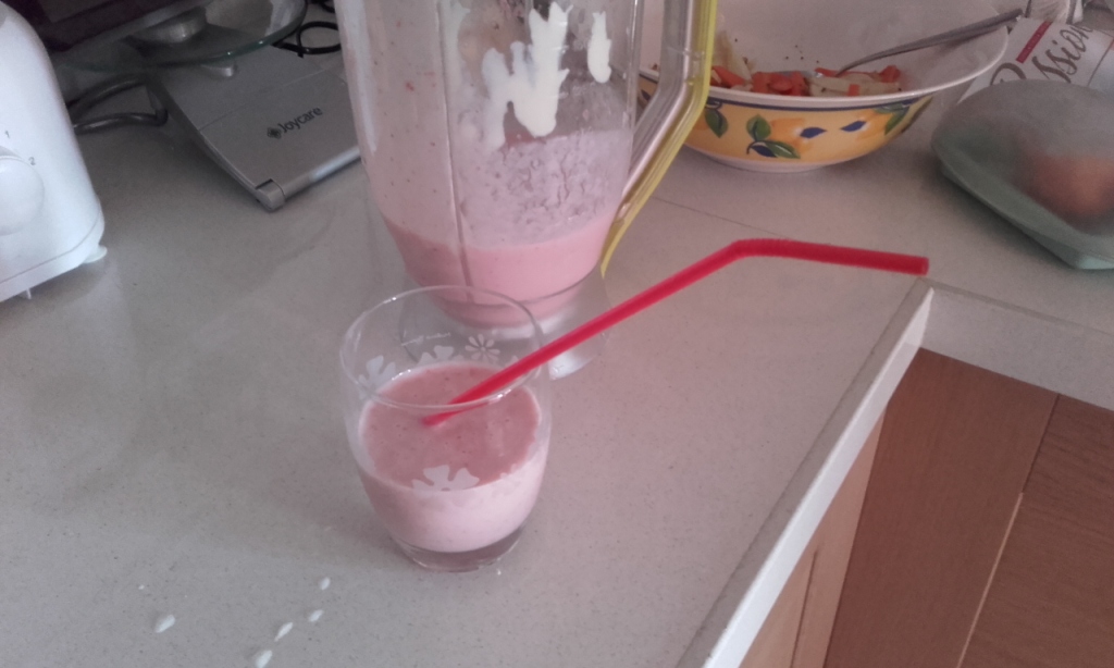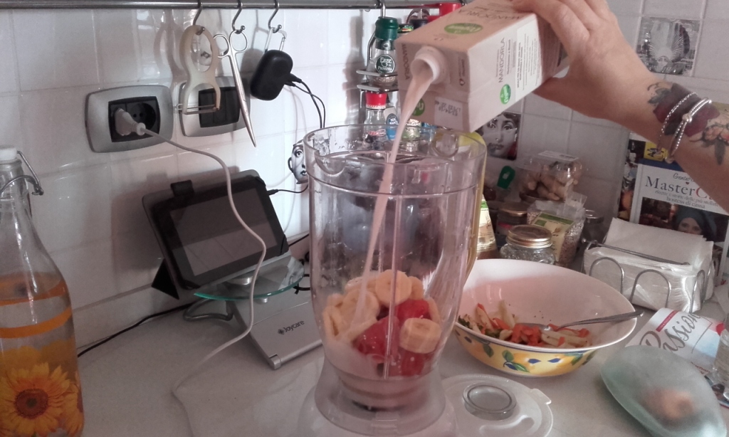 Inserire nel un mixer la frutta e coprire bane e fragole con il latte |